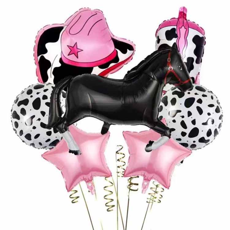 सटीक रेखा आकृति और रंग मिलान के साथ, वे दौड़ते घोड़ों की मांसपेशियों की आकृति और बहती अयाल को बहाल करते हैं, और भूरे और काले जैसी सामान्य प्राकृतिक रंग योजनाएं घोड़ों की वास्तविक छवि से बेहतर मेल खाती हैं। कुछ काउबॉय थीम वाले फ़ॉइल गुब्बारे दृश्य प्रभाव को बढ़ाने के लिए चांदी और सोने जैसे धातु के रंग भी जोड़ते हैं; गाय का पैटर्न गोलाकार है, जिस पर काले और सफेद गाय के पैटर्न मुद्रित हैं, और कुछ शैलियों में कुछ त्रि-आयामी सजावट जैसे छोटी घंटियाँ और प्लस शामिल हैंएल्युमीनियम फ़ॉइल गुब्बारों के नीचे श पूंछें हैं, जो सुंदर और ग्रामीण शैली दोनों हैं, और परिवारों के लिए काउबॉय गतिविधियों के लिए एक बहुत लोकप्रिय विषय हैं।
