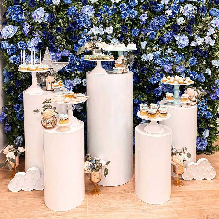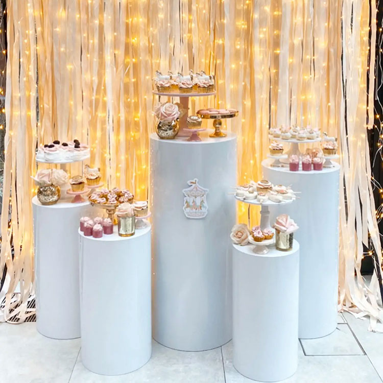 बेलनाकार आधार वाली मिठाई की मेज कंटेनर और आभूषण दोनों के रूप में कार्य करती है। आमतौर पर, वे विभिन्न संयोजनों में आते हैं: 3-टुकड़ों का संयोजन, 5-टुकड़ों का संयोजन, 7-टुकड़ों का संयोजन, इत्यादि। सबसे आम संयोजन पाँच टुकड़ों का है। विभिन्न आकारों की स्वतंत्र बेलनाकार ट्यूबों को लचीले ढंग से व्यवस्थित किया जा सकता है, और वे दृश्य का एक महत्वपूर्ण हिस्सा हैं। साथ ही, हम आकार और आकार के लिए अनुकूलन भी प्रदान करते हैं। इसके अलावा, वे आपकी पार्टी की सजावट से मेल खाते हैं।