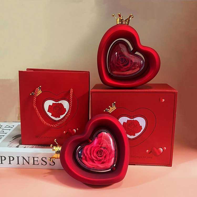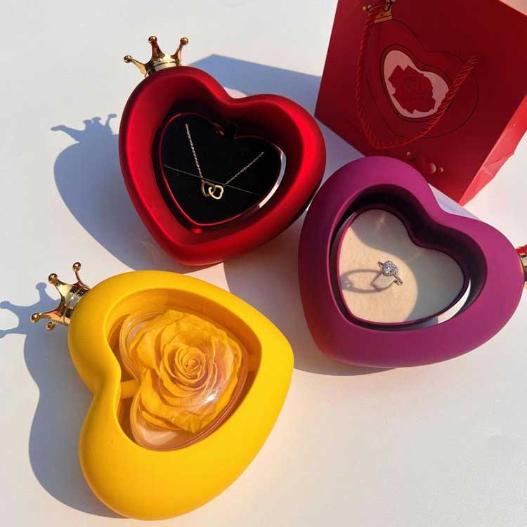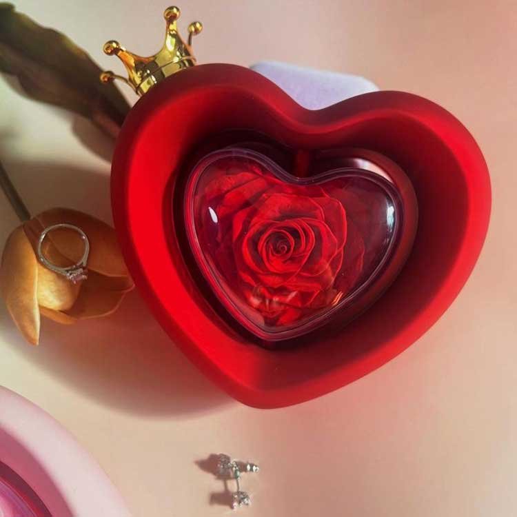 हार्ट शेप रोज़ ज्वेलरी बॉक्स में ग्रेड ए संरक्षित फूलों का उपयोग किया जाता है, जिनका रंग और बनावट ताजे फूलों से अप्रभेद्य होता है।
