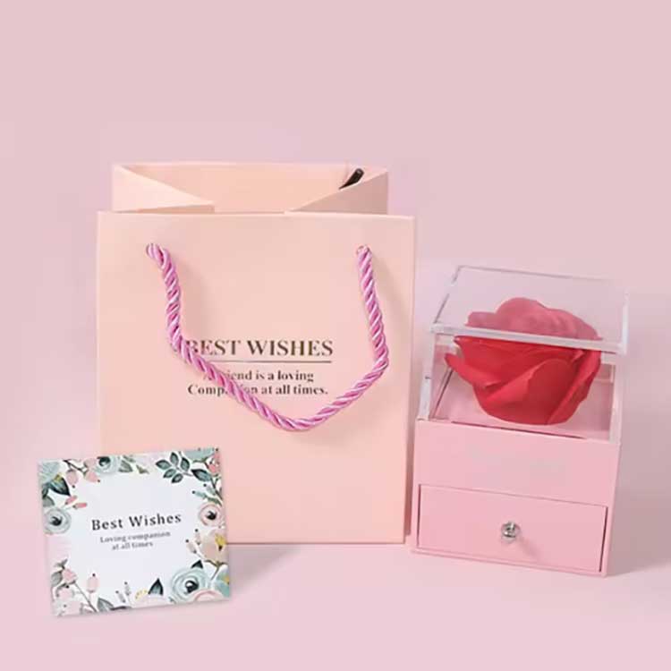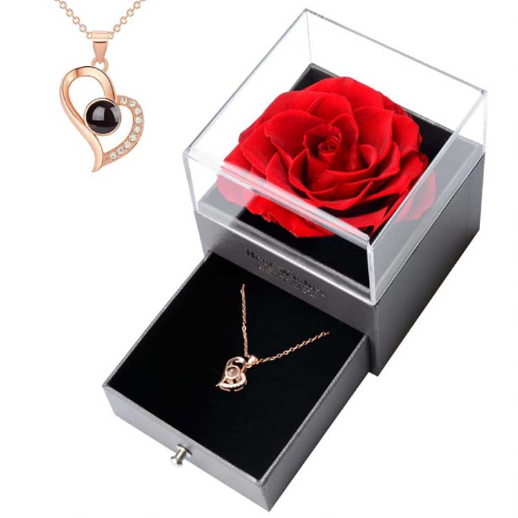 इम्मोर्टल फ्लावर उपहार बॉक्स में आभूषण भी हमारा विशेष डिजाइन है। हमने आभूषण के इस टुकड़े के लिए तीन मुख्य रंगों को डिजाइन किया है: सोना, चांदी और गुलाबी सोना। इसे उच्च परिशुद्धता इलेक्ट्रोप्लेटिंग तकनीक का उपयोग करके बनाया गया है, जिससे यह सुनिश्चित होता है कि लंबे समय तक पहनने के बाद भी यह फीका या जंग नहीं लगेगा। आभूषणों में लगे हीरे 5ए ग्रेड ज़िरकोनियम से बने होते हैं, और 20 वर्षों के अनुभव वाले एक डिजाइनर द्वारा सावधानीपूर्वक सेट किए जाते हैं।