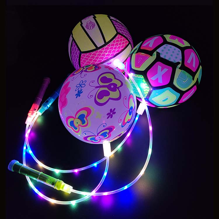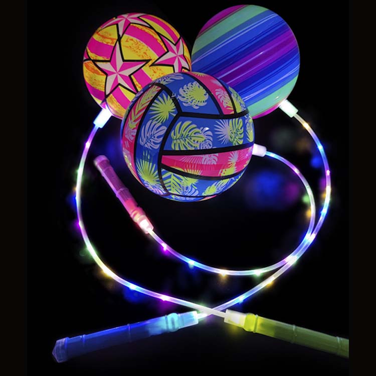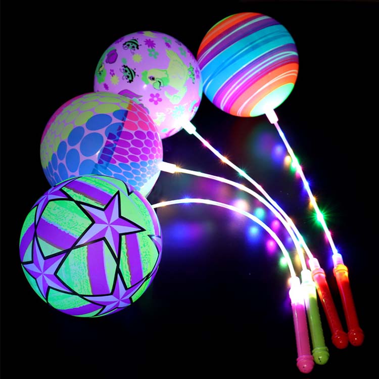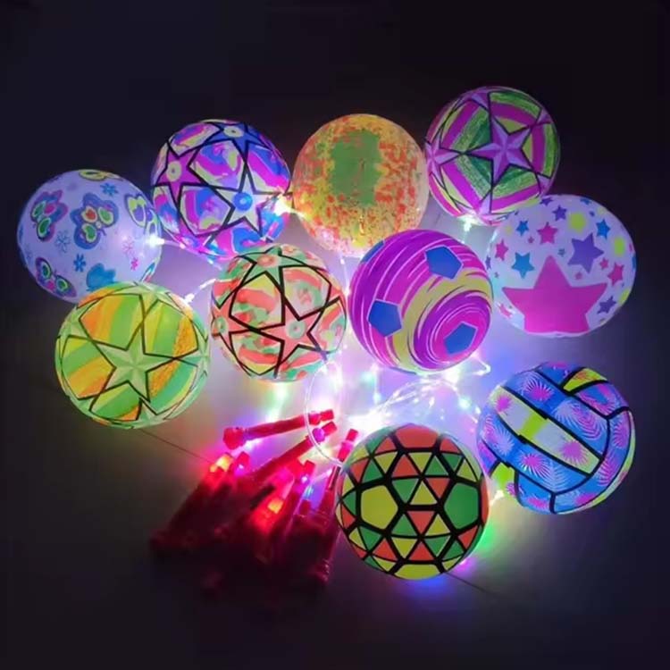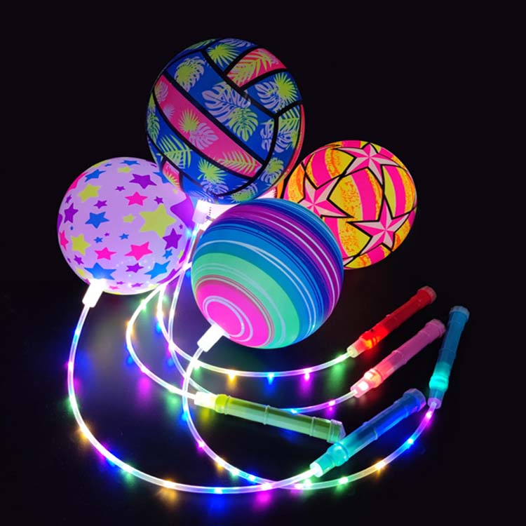 एलईडी लाइट्स के साथ स्ट्रिंग बाउंसी बॉल्स बाउंसी बॉल हैं, जो स्ट्रिंग से बंधी हुई हैं, एलईडी लाइट्स के अंदर या सतह पर एम्बेडेड हैं। जब फ़्लिप किया जाता है, तो एलईडी जब आप उछालते हैं, झूलते हैं, या इसे पकड़ते हैं, तो रंगीन रोशनी का उत्सर्जन करते हैं। ये रोशनी अंधेरे वातावरण में अधिक दिखाई देती हैं।